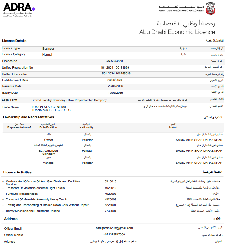 Fusion Star General Transport provides dependable pickup truck rental services across Abu Dhabi. We support daily work, weekly projects, and long term transport needs with a clean fleet, trained and licensed drivers. Our office is based in “Al Sarab Commercial Center Office No. 21, M-14 Musaffah Industrial Area Abu Dhabi, United Arab Emirates” and we serve all major regions within Abu Dhabi.