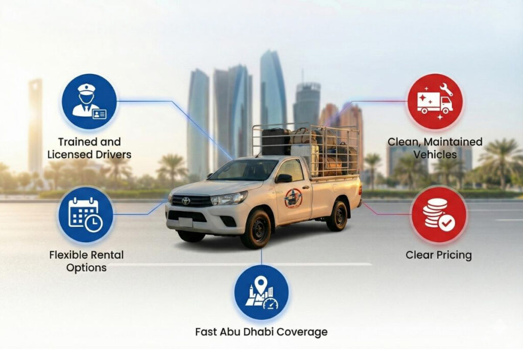 Our 1 ton pickup truck Abu Dhabi rental service supports businesses and individuals who need quick and safe transport across the city. From residential towers in Reem Island to commercial zones in Musaffah, our drivers understand Abu Dhabi’s roads, community access rules and building delivery points.